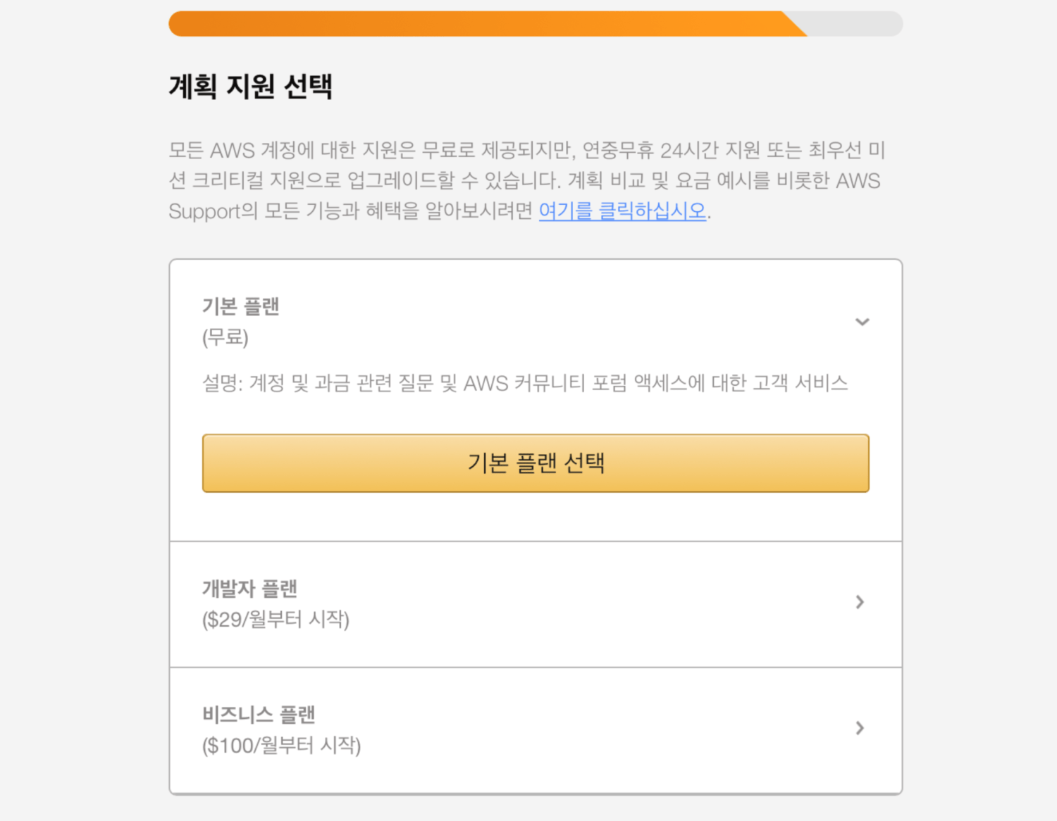 아마존 웹 서비스는 상용 서비스이므로, 서포트를 통해서 항상 지원을 받을 수 있습니다. 하지만 무료로 사용할 경우 우선순위가 아주 낮기 때문에 답변이 언제 올지 알 수 없습니다. 이에 따라서 지원이 중요한 경우 서포트 플랜을 추가로 구매할 수 있습니다. 하지만 테스트 용도나 개인 개발 용도라면 서포트 플랜을 굳이 구매할 필요는 없습니다. 그리고 계정 생성 이후에도 추가로 신청할 수 있기 때문에 기본 플랜을 선택하고 다음으로 넘어갑니다.