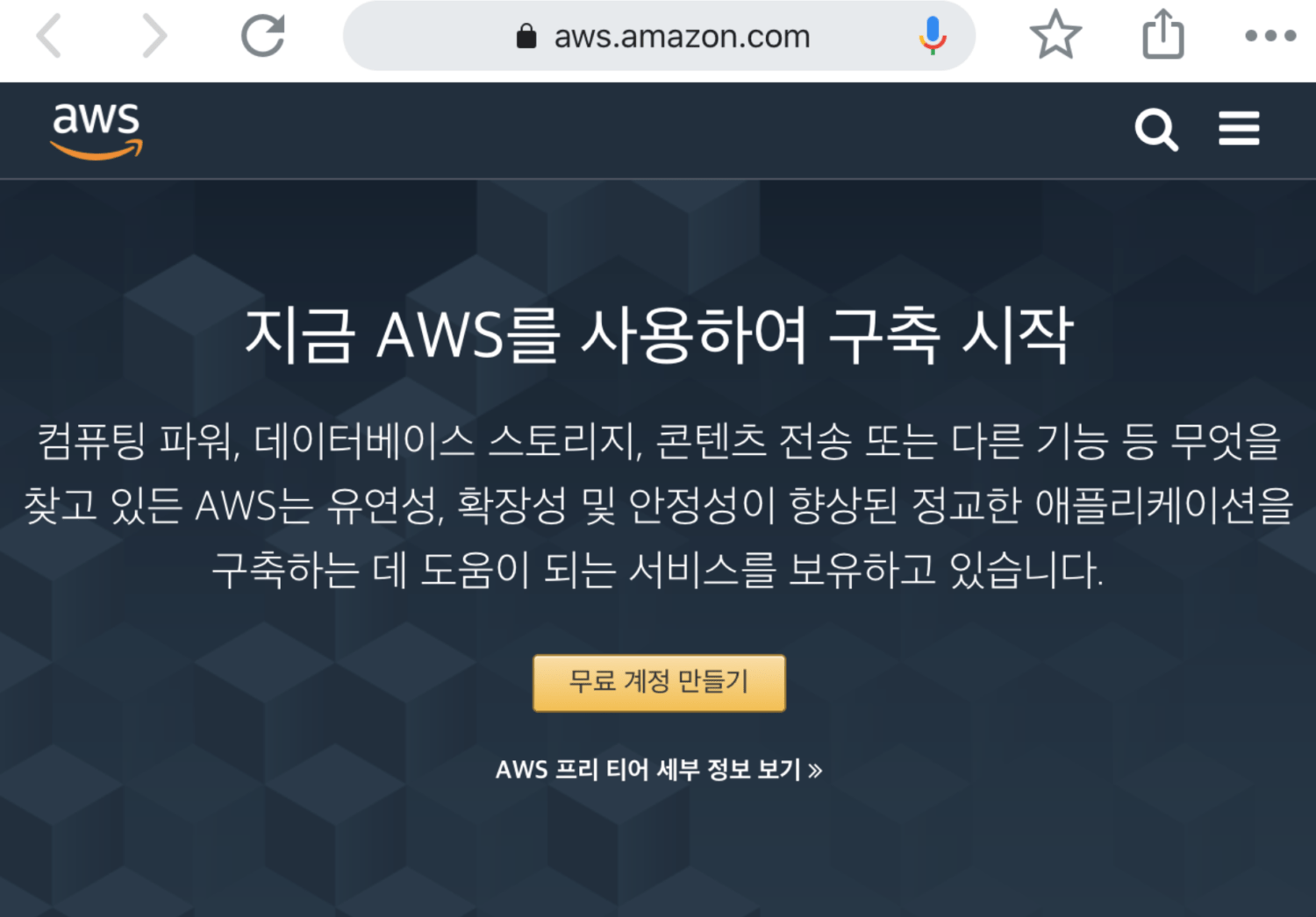 그럼 본격적으로 계정을 생성해보겠습니다. 아마존 계정 생성을 위해서는 먼저 아마존 웹 서비스 사이트로 이동합니다.