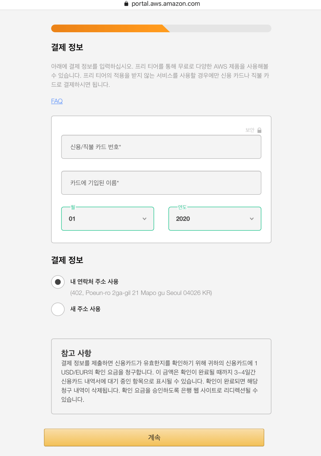 결제 정보를 입력합니다. 아마존 웹 서비스의 계정은 무료로 만들 수 있고 다양한 기능을 일정 기간 동안 무료로 사용할 수 있습니다. 하지만 아마존 웹 서비스는 유료 서비스이며, 무료 사용량을 초과할 경우 바로 요금이 청구됩니다. 따라서 미리 결제 정보를 등록해야만 계정을 등록할 수 있습니다.