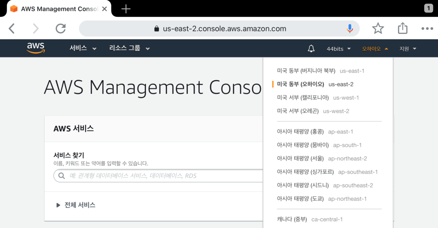 자, 이제 아마존 웹 서비스 웹 콘솔에 들어왔습니다.