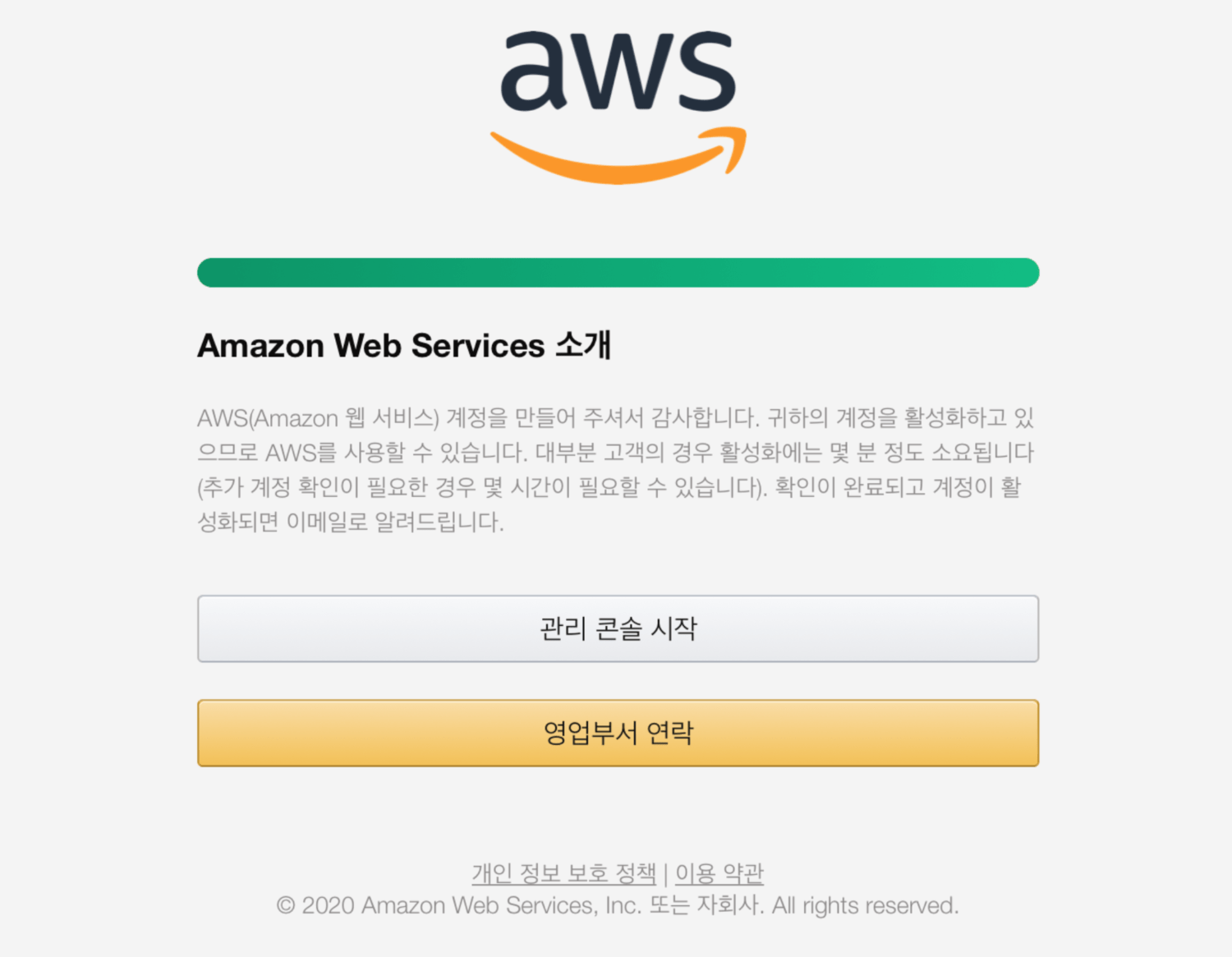 이걸로 아마존 웹 서비스 계정 생성이 끝났습니다. 관리 콘솔 시작을 클릭하면, 로그인 페이지로 이동합니다.