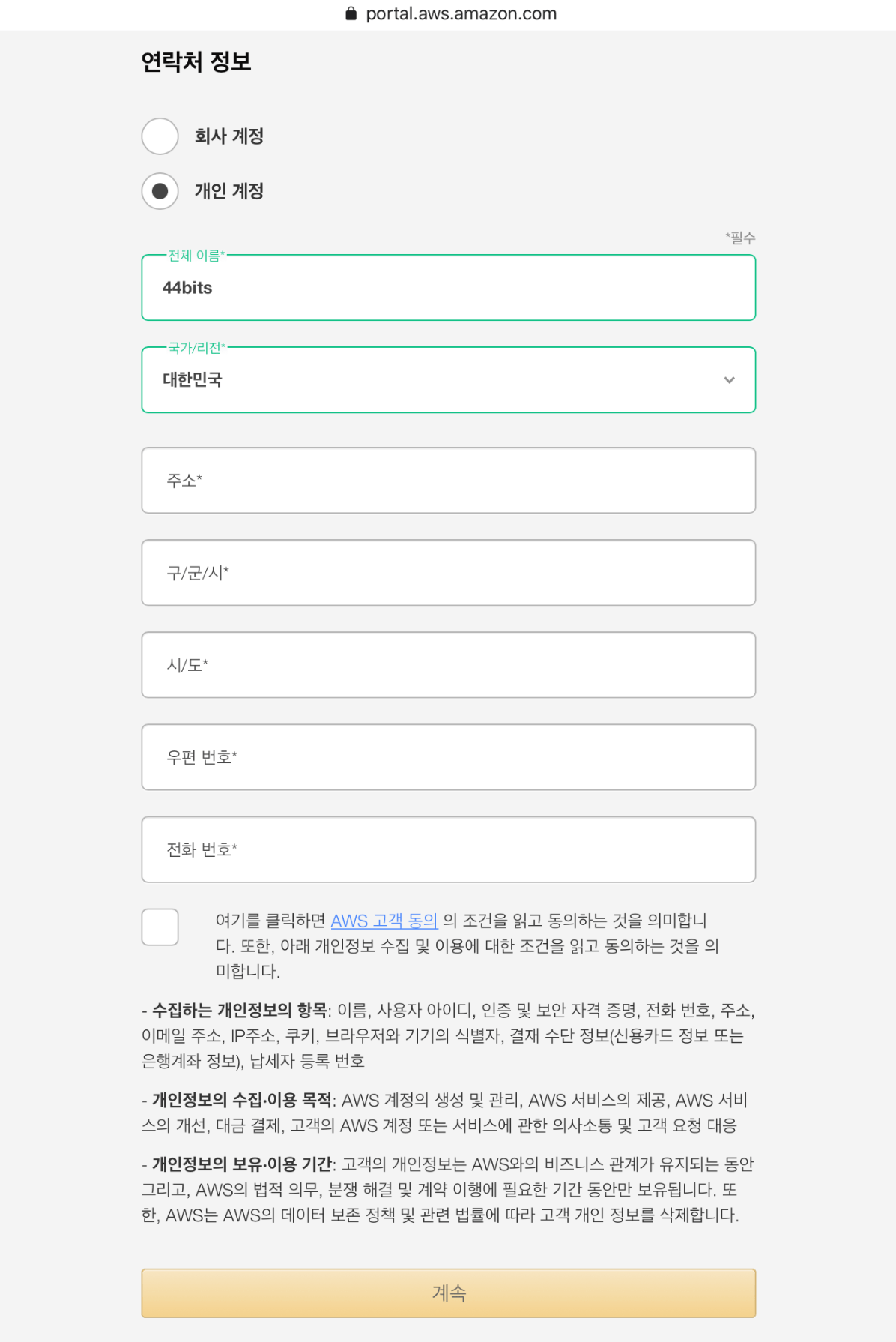아마존 웹 서비스 계정은 크게 회사 계정과 개인 계정 2가지가 있습니다. 여기서는 개인 계정을 선택했습니다. 그 다음으로 주소를 입력해야하는데, 이 때 영문으로 입력해야합니다. 미리 준비해둔 영문 주소를 입력합니다. 아래 AWS 고객 동의 조건을 살펴보고 이에 동의한다면 체크하고 다음으로 넘어갑니다.