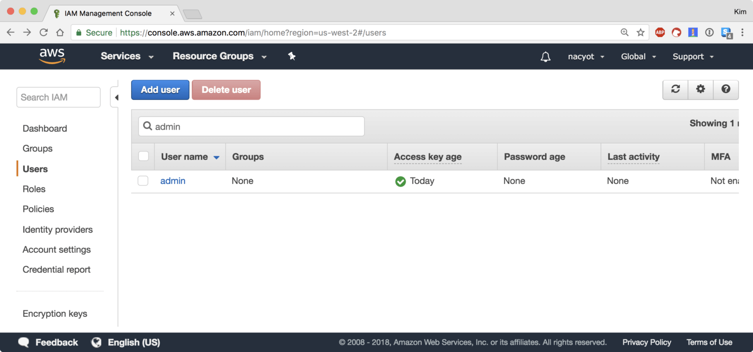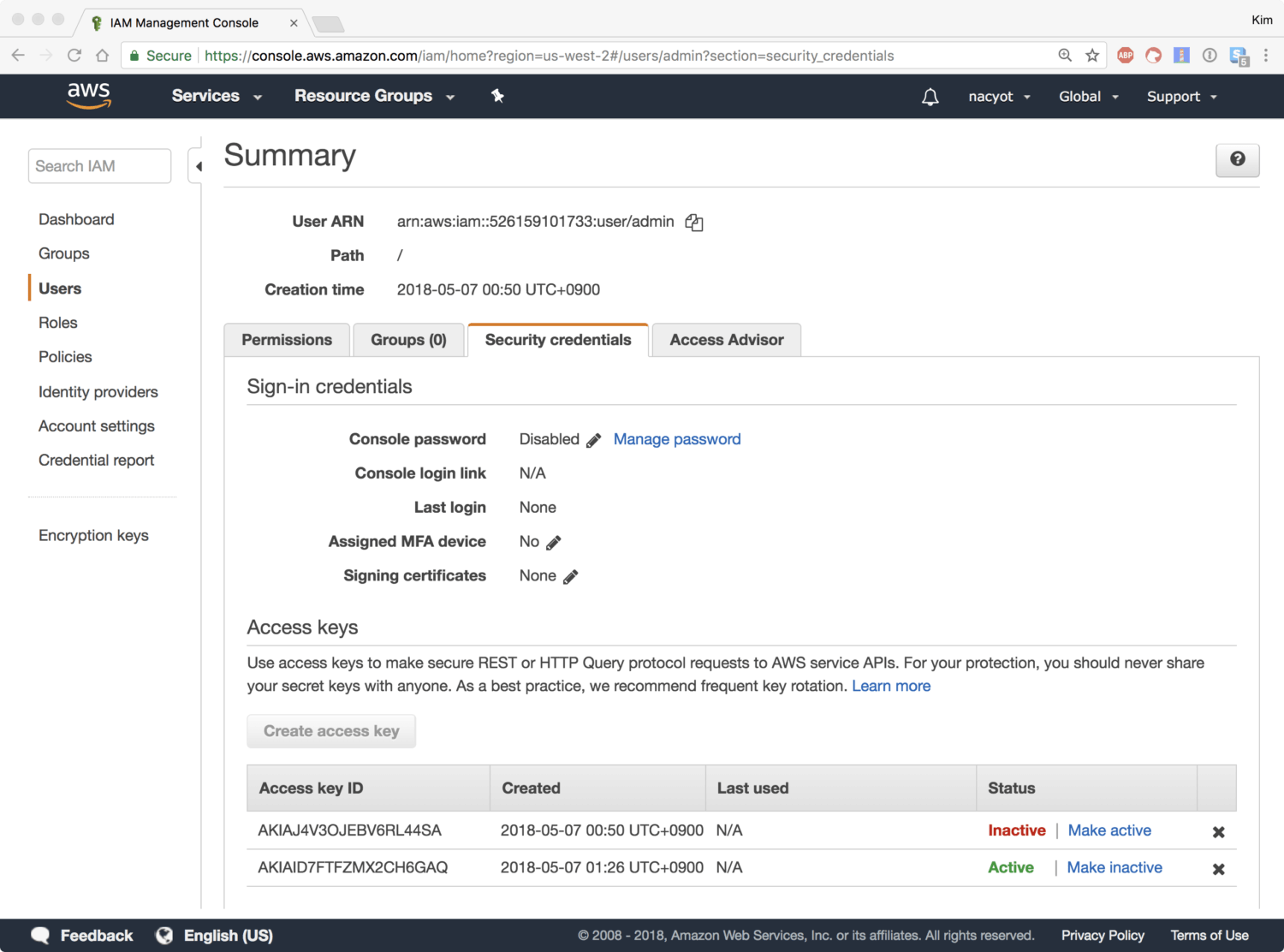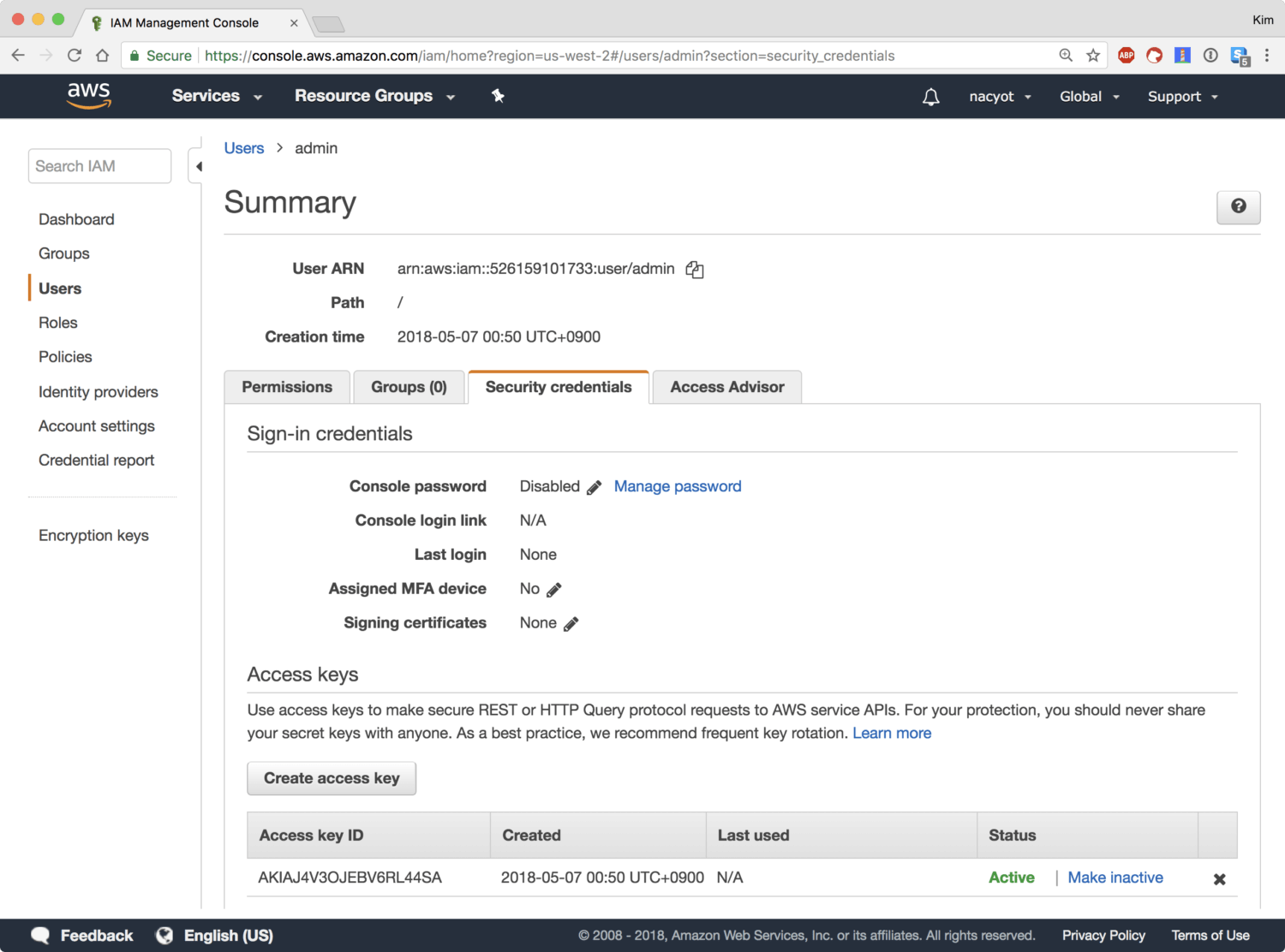 이것으로 admin 사용자가 생성되었습니다. 앞서 지정한 대로 admin 사용자는 프로그래밍 방식 액세스Programmatic access를 사용하기 때문에 로그인하는 것은 불가능합니다. 대신에 지금 발급된 키로 API에 접근하는 것이 가능합니다.