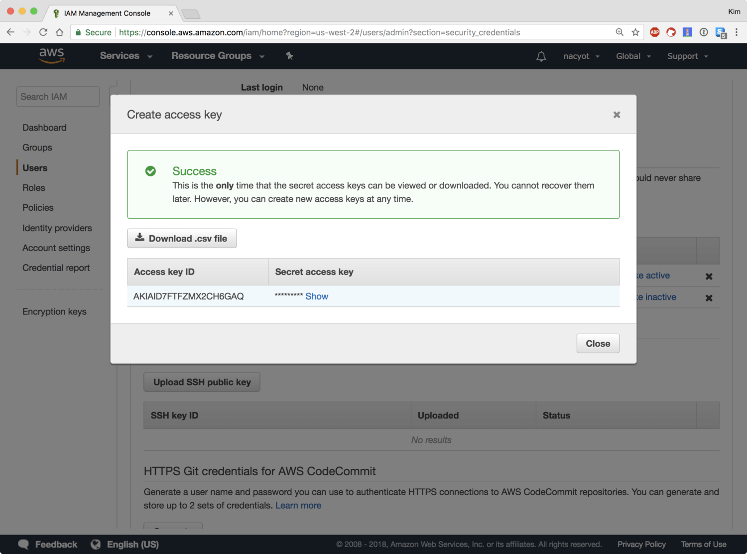 로 마스킹 되어있습니다. 보기Show를 클릭하면 값을 확인할 수 있습니다. 혹은 .csv로 다운로드Download .csv 버튼을 클릭해 액세스 키 쌍을 파일로 다운받을 수도 있습니다.