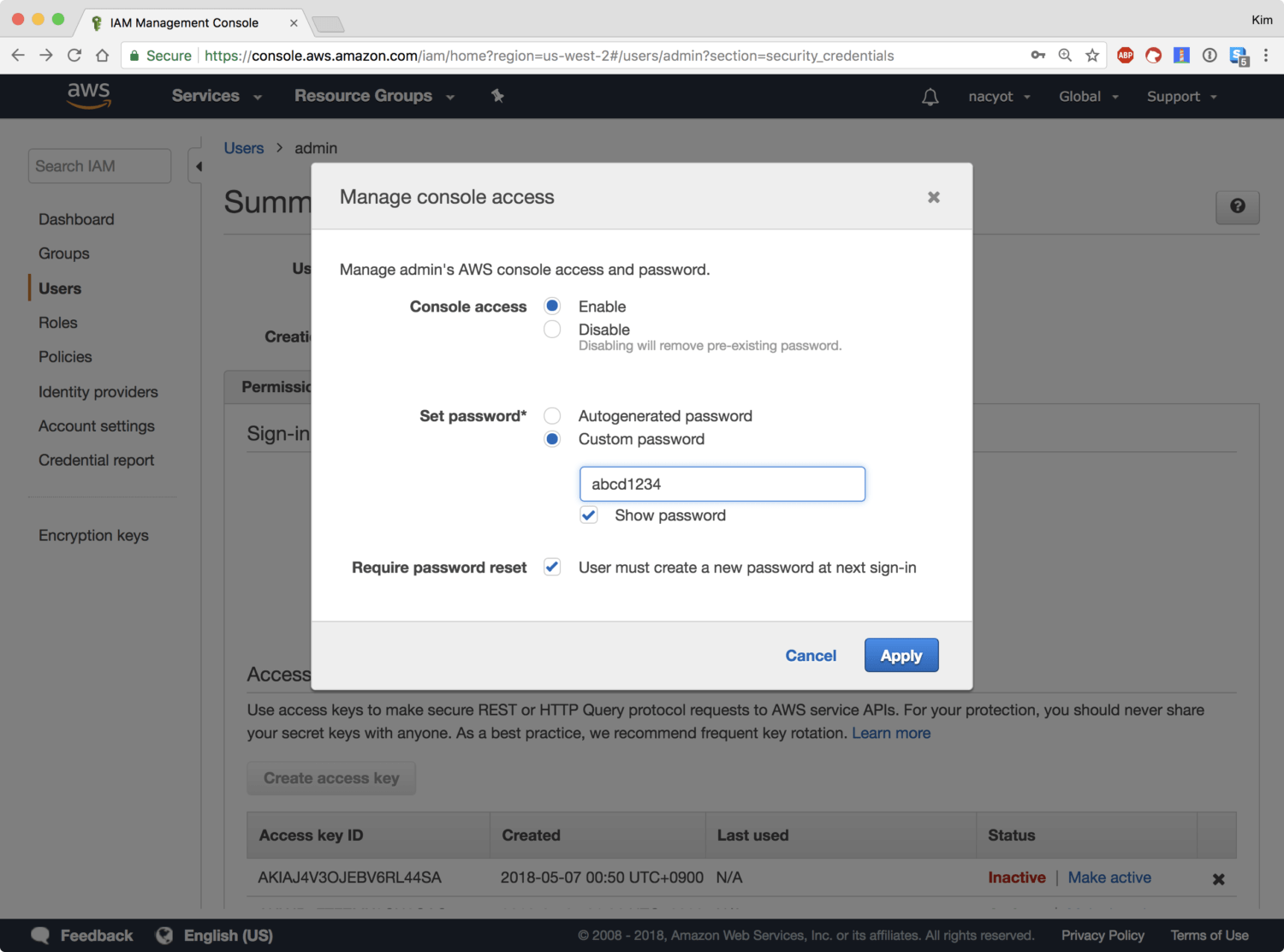 를 패스워드로 지정하고*, 첫 로그인 시 변경하는 옵션에 체크합니다. 적용Apply를 클릭합니다.