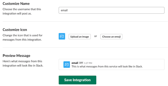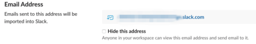 으로 끝나는 새로운 이메일 주소가 하나 표시됩니다. 이 주소로 이메일을 받으면 앞에서 설정한 슬랙 채널로 이메일이 전달됩니다. 아래 쪽의 Customize Name 이나 Icon을 설정해서 변경해도 되고 그대로 두어도 됩니다. 기본값인 Email보다는 그룹 이메일 이름으로 변경해서 사용하는 걸 추천합니다.