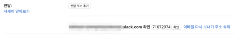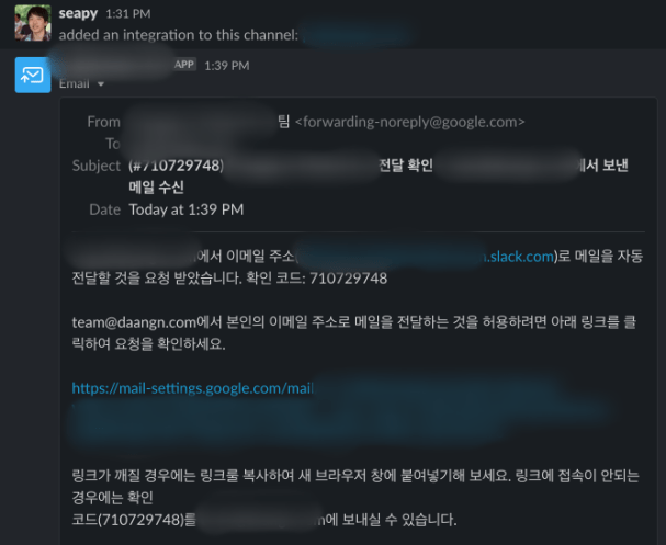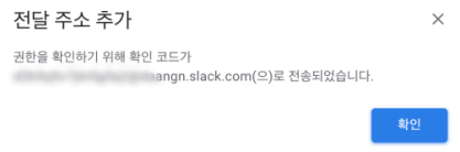 확인 버튼을 누른후 보면 슬랙 채널에 확인 코드가 온 것을 확인할 수 있습니다. 여기서 받은 전달 확인 코드를 복사합니다.