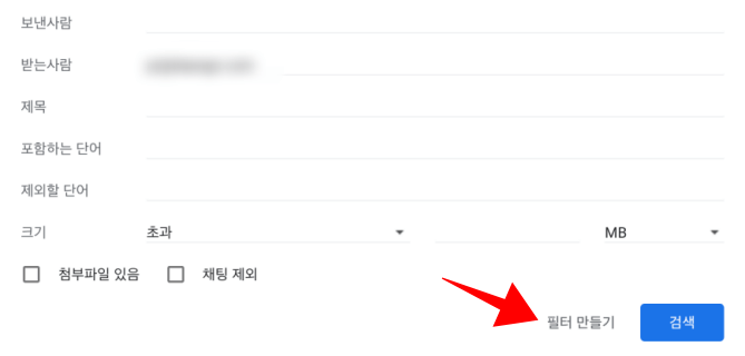 여기서는 받는 사람 주소가 그룹 이메일 주소일 경우를 조건으로 했지만 그 외에 보낸 사람이나 제목에 특정 단어 포함등 다양한 조건을 설정할 수 있습니다. 원하는 조건을 입력후 “필터 만들기” 버튼을 클릭합니다.