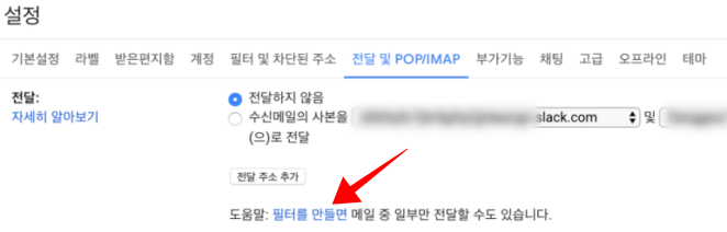 전달 및 POP/IMAP 탭에서, 이메일을 전달할 조건을 설정하기 위해 “필터를 만들면”의 링크를 클릭합니다.