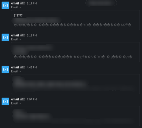 여기까지 설정이 완료 되었습니다. 앞으로 지정된 조건에 해당하는 이메일이 오는 경우 아래와 같이 슬랙으로 이메일이 전달됩니다(첨부파일도 잘 전달됩니다.)