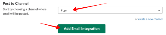 Post to Channel 은 이메일을 받을때 어떤 채널로 보낼지 선택합니다. 이때 새로운 채널을 만들어도 되고, 기존에 있던 채널을 선택할 수도 있습니다. 채널을 선택 후 Add Email Integration 을 클릭합니다.