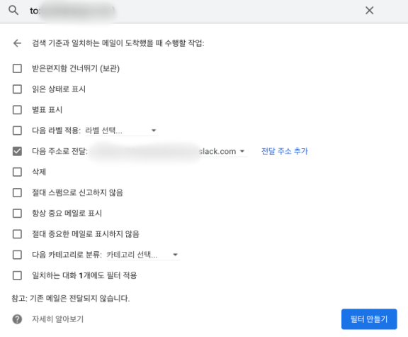 다음 단계에서는 필터 조건에 해당하는 경우 수행할 작업을 지정합니다. “다음주소로 전달”을 체크하고 앞서 입력했던 slack.com