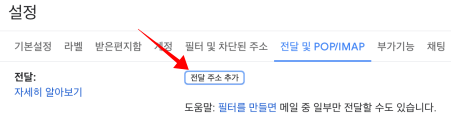 “전달 및 POP/IMAP” 탭을 클릭하고 “전달 주소 추가”를 클릭합니다.