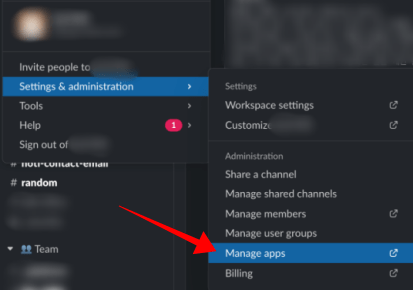슬랙 앱의 왼쪽 메뉴에서 Settings > Manage apps 를 클릭합니다.