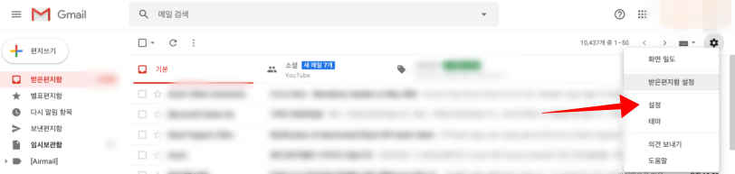그룹 이메일 주소가 Gmail 이라고 가정하고 진행합니다.(대부분 이메일 서비스도 Gmail 과 비슷한 기능을 제공합니다.) Gmail 에서 오른쪽 위의 톱니바퀴 아이콘을 클릭 후 설정을 클릭합니다.